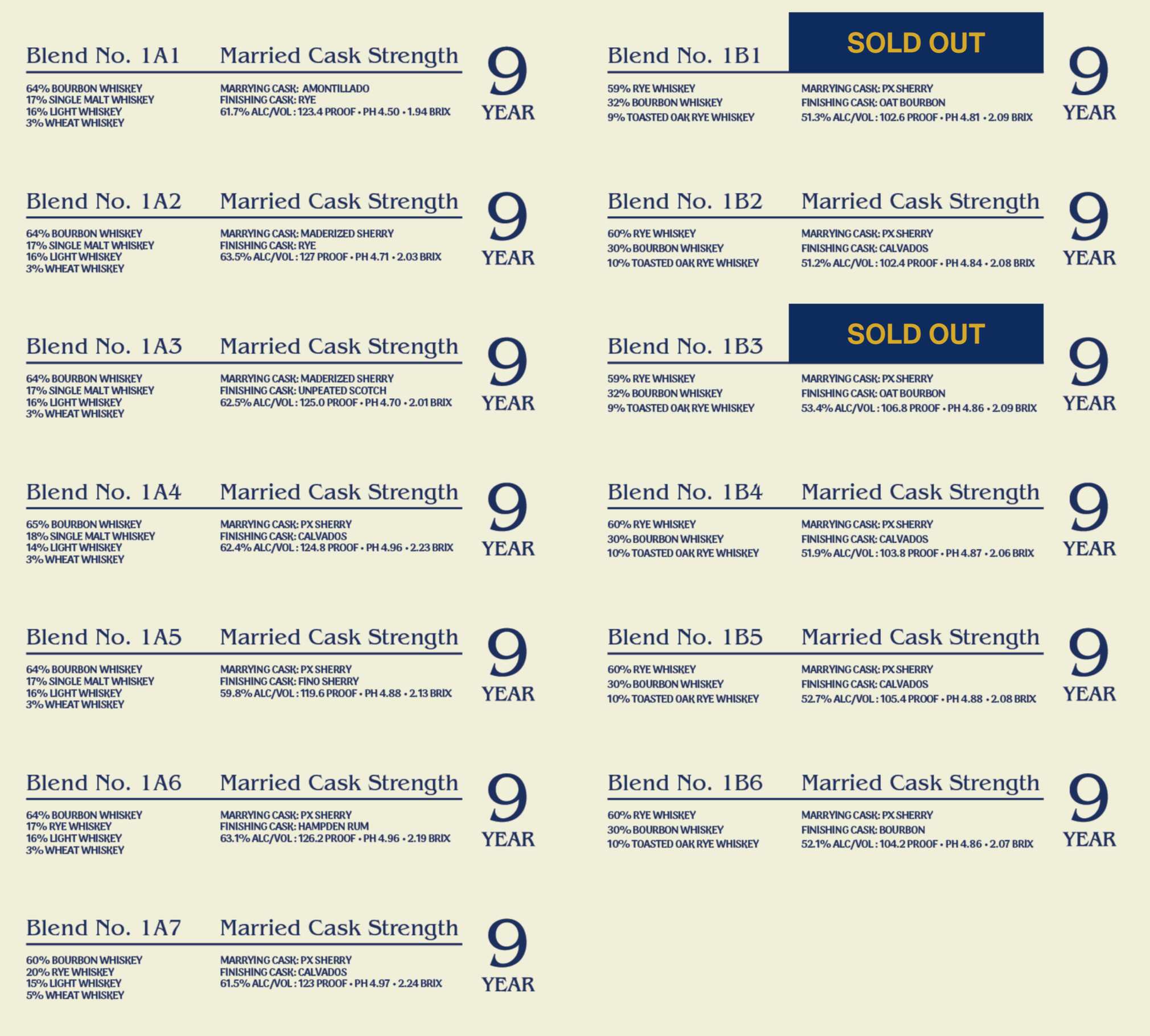 These are big, loud, flavorful whiskeys that leverage the available acidity, tannin, and sweetness from multiple barrel treatments. They are high proof, bold, and show their maturity (9-16 years). They also speak to our dedication to refinement and reimagining of process. The importance of creativity driving experimentation, but analysis and taste driving decisions. Each one of these 13 casks was polished as its own attempt at a perfect blend, but each was also realized on its own terms.